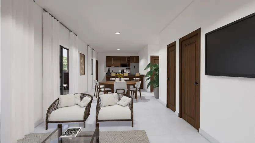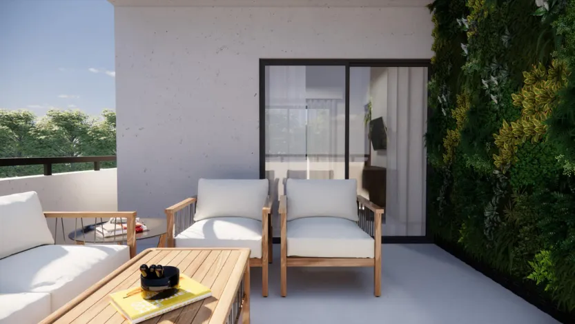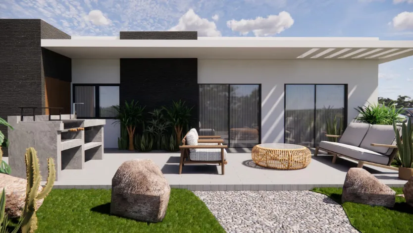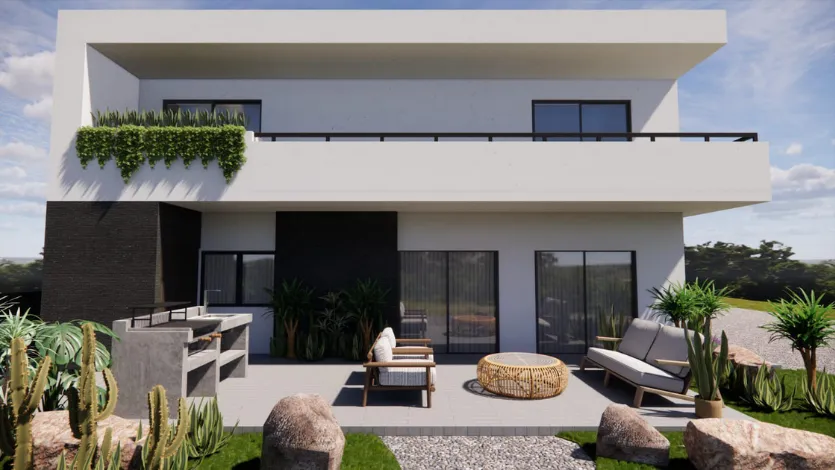 Con villa construida de 85m² y una amplia terraza de 35m² con acabado cerámico tipo madera, equipado con asador.